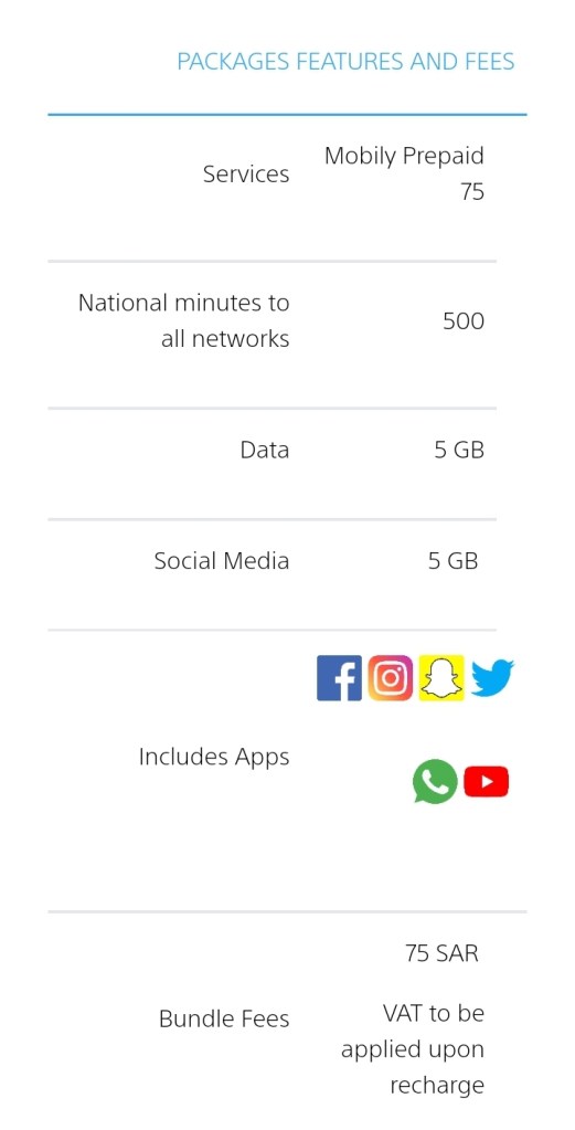 Par exemple avec un forfait de 75 riyals vous avez droit a 500 mn d’appels local verd tous réseaux, 5 giga de data (internet) et 5 giga pour les reseaux sociaux ( whatsapp, YouTube, snapchat, twitter, facebook, instagram…) pour une duree de un mois.
