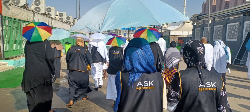 Ensuite autour de 7h nous avons pris la route des jamaraates situés a 3,3 km de nos tentes. Tous nos pèlerins etaient armés de bouteilles d’eau fraiche et de parasols offerts gracieusement par la commission nationale du hadj à tous les pèlerins.