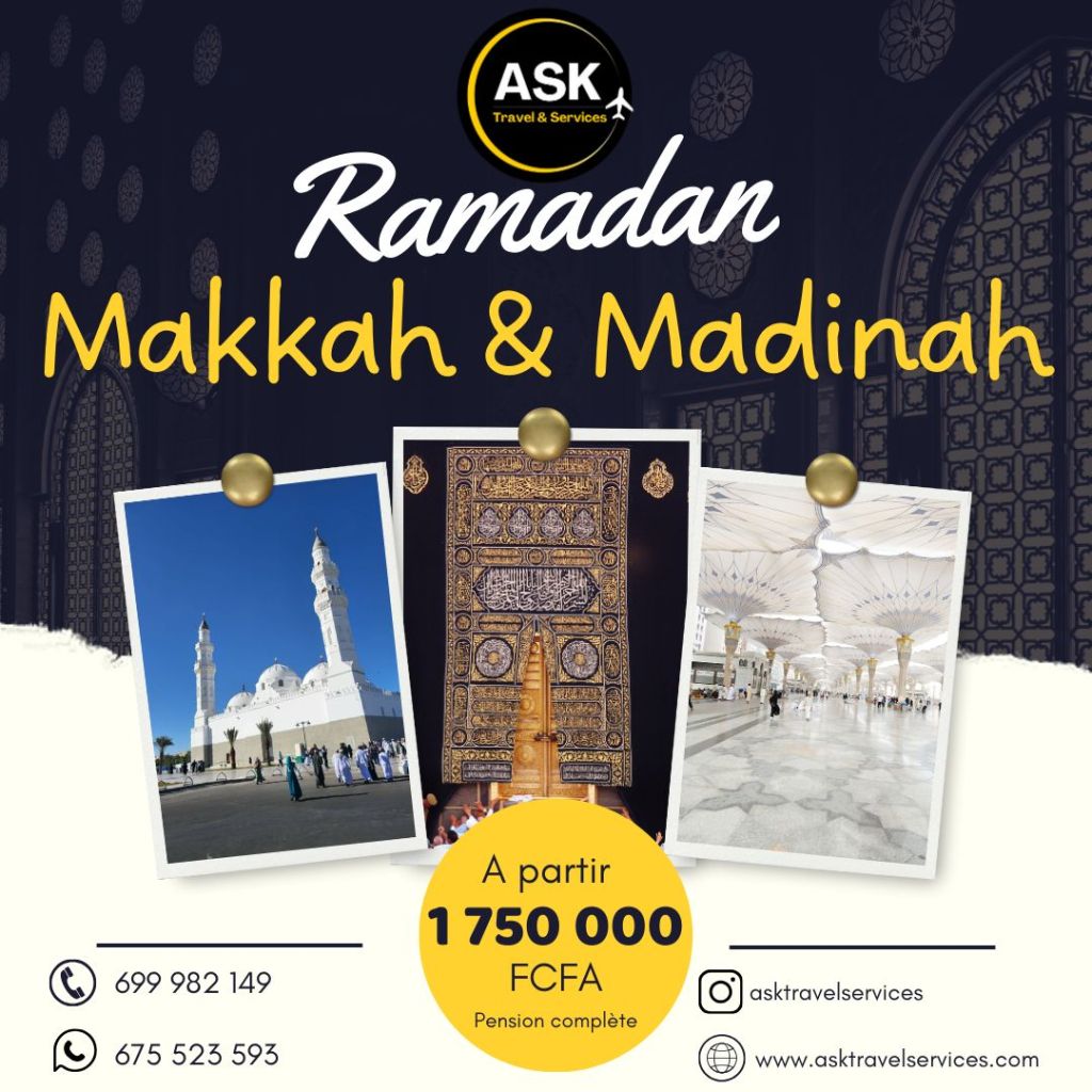 ASK vous propose de souscrire à un package en pension complète avec iftar et souhour dans des hôtels 4* pour accomplir vos actes d’adoration en toute sérénité avec le soutien de guides expérimentés et attentionnés.