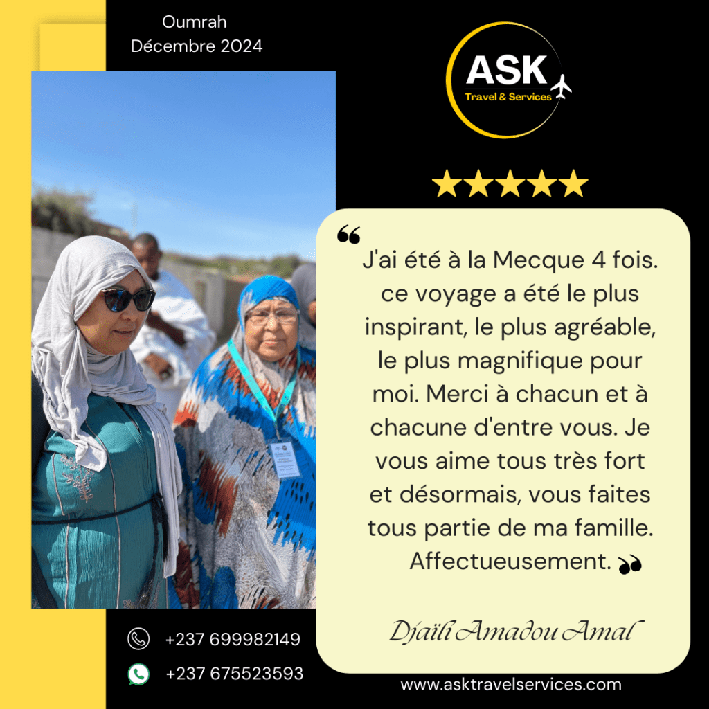 J’ai été à la Mecque 4 fois. ce voyage a été le plus inspirant, le plus agréable, le plus magnifique pour moi. Merci à chacun et à chacune d’entre vous. Je vous aime tous très fort et désormais, vous faites tous partie de ma famille.